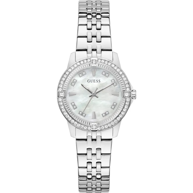 Γυναικείο ρολόι διαμέτρου 32mm με μηχανισμό QUARTZ ακριβείας. Έχει ιριδίζον καντράν με ασημένιους δείκτες και λεπτομέρειες και είναι διακοσμημένο με πέτρες. Η κάσα του είναι ασημένια από ανακυκλωμένο ατσάλι και έχει κρύσταλλο από ορυκτό κρύσταλλο ειδικής σκλήρυνσης. Έχει μπρασελέ από ανακυκλωμένο ατσάλι με κούμπωμα ασφαλείας. Δεν είναι αδιάβροχο.