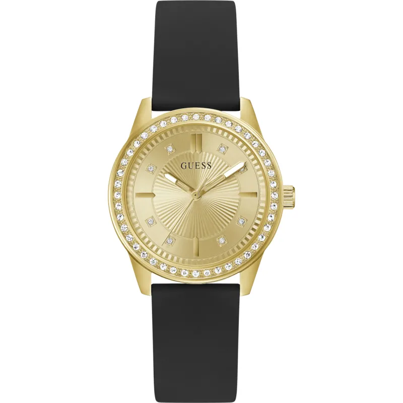 Γυναικείο ρολόι διαμέτρου 36mm με μηχανισμό QUARTZ ακριβείας. Έχει χρυσό καντράν με χρυσούς δείκτες και λεπτομέρειες και είναι διακοσμημένο με πέτρες. Η κάσα του είναι χρυσή από ανακυκλωμένο ατσάλι και έχει κρύσταλλο από ορυκτό κρύσταλλο ειδικής σκλήρυνσης. Έχει λουράκι από καουτσούκ με κούμπωμα τοκάς. Δεν είναι αδιάβροχο.