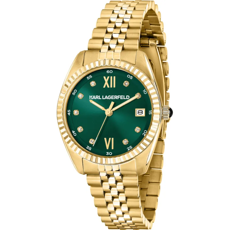 Γυναικείο ρολόι διαμέτρου 32mm με μηχανισμό Quartz ακριβείας. Έχει πράσινο καντράν με χρυσούς δείκτες και λεπτομέρειες και είναι διακοσμημένο με πέτρες. Η κάσα του είναι από ανοξείδωτο ατσάλι με κρύσταλλο από ορυκτό κρύσταλλο. Έχει μπρασελέ από ανοξείδωτο ατσάλι και κούμπωμα ασφαλείας. Είναι αδιάβροχο (5 ΑΤΜ).